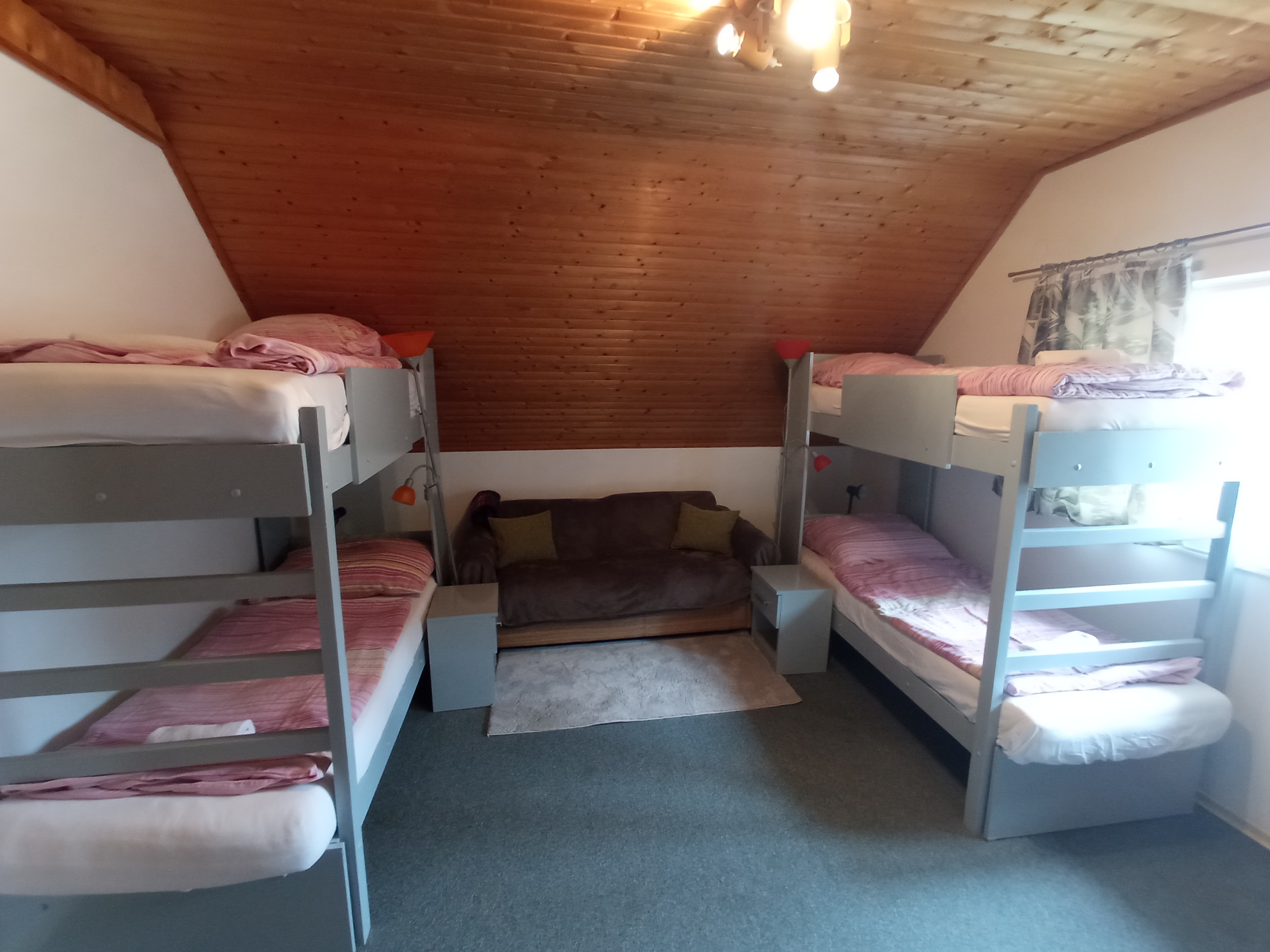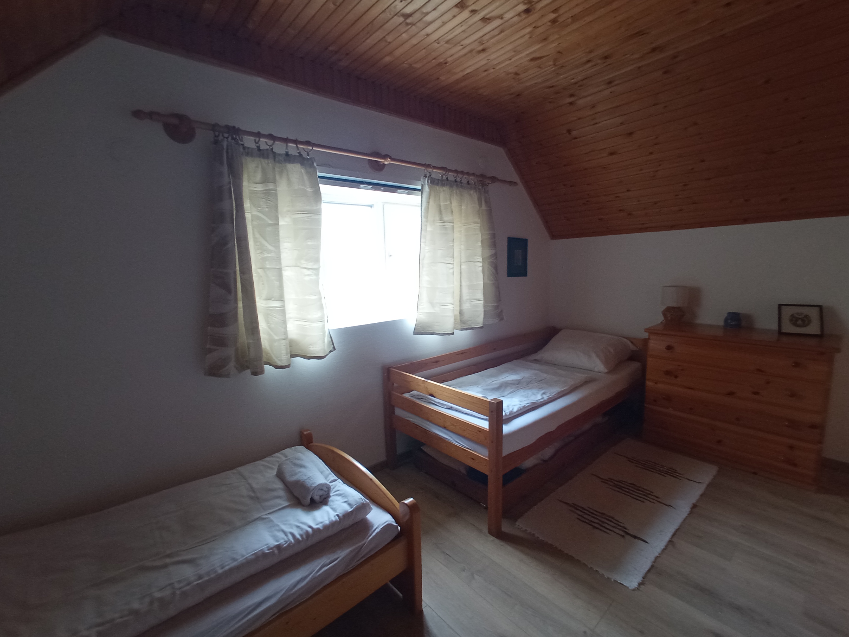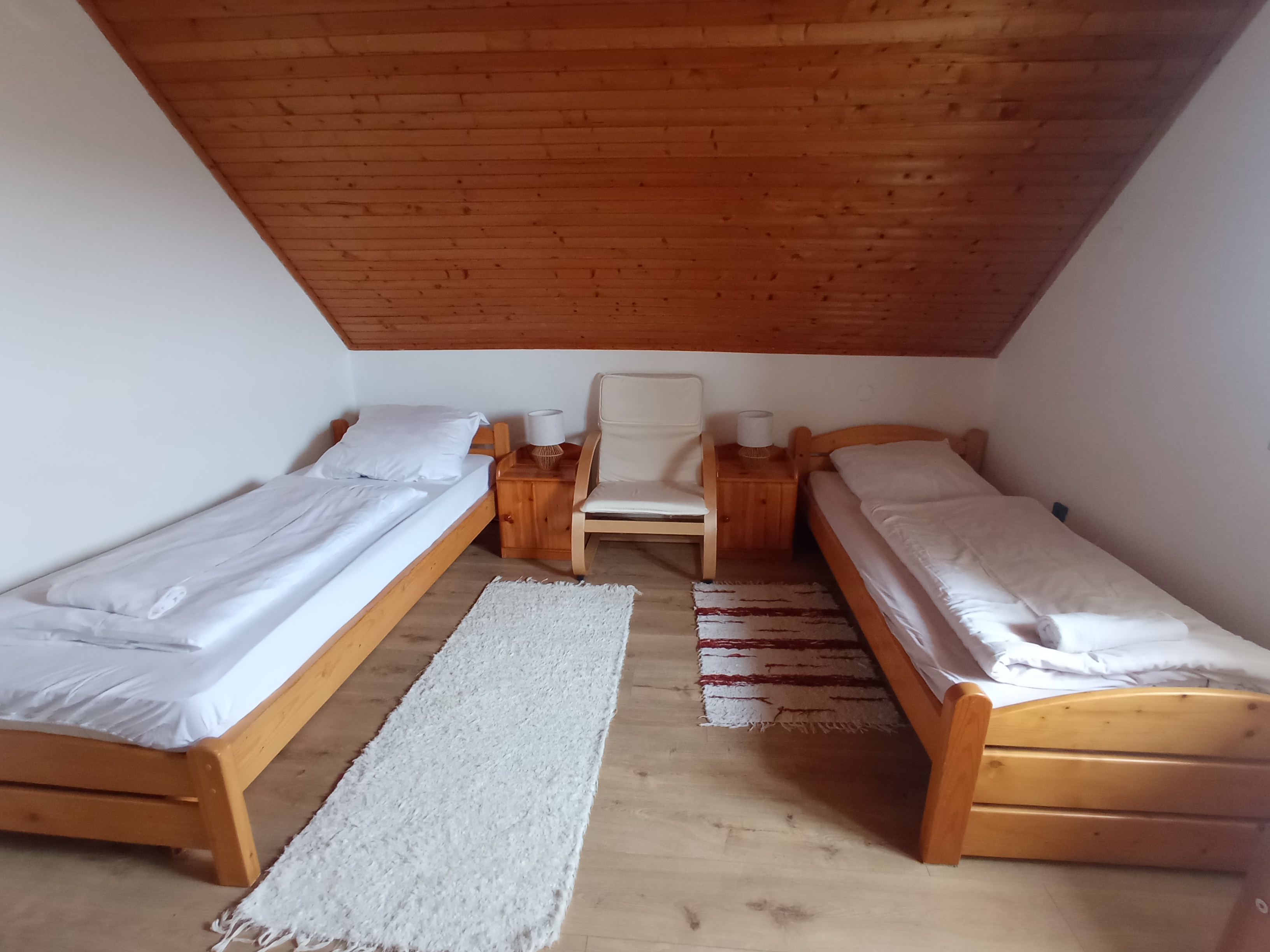 A vendégház 3 szintes dupla összkomfortos magánszállás, mely teljes egészében a vendégek részére fenntartott és 16 fő fogadására alkalmas. A lakószinten található egy hatalmas nappali-étkező, kandallóval és teljesen felszerelt konyhával, komplett fürdőszobával és egy kétfős hálószobával. A felső szinten 3 szoba került kialakításra egy 6 ágyas, és 2 db 3 ágyas szoba, igény szerint pótágyakkal valamint egy dupla fürdőszoba. Az alsó szinten található egy tágas játszóterem: ping-pong asztal, versenycsocsó. A kertben hangulatos terasz és kinti sütögetésre kiválóan alkalmas bográcsozó és grillező helyek várják a természet ölelésében kedves vendégeinket."